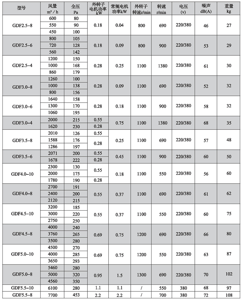 三、GDF系列離心式管道風(fēng)機性能參數(shù)表